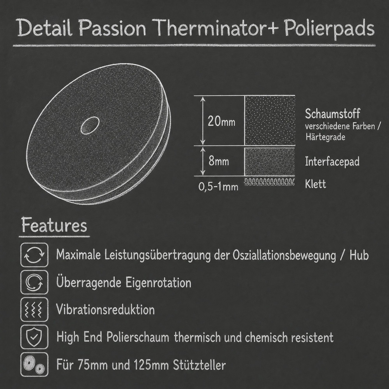 Das speziell entwickelte Interfacepad der Therminator+ Polierpads folgt einem klaren Prinzip: maximale und verlustarme Übertragung der Exzenterbewegung. Während viele Polierpads auf weiche Strukturen zur Vibrationsdämpfung oder vermeintliche Kühlung setzen – oft mit spürbarem Leistungsverlust – konzentriert sich Detail Passion auf echte Performance.