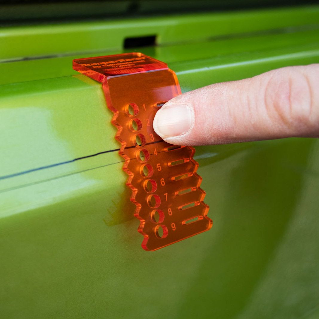 Paint protection films are trending: Whether for expensive special paints or maintaining the value of commercial and service vehicles, the topic of PPF (Paint Protection Film) is on everyone's lips, providing detailers and car care businesses with additional contracts. When partially wrapping the loading edges of station wagons and SUVs, the goal is to cover only the vulnerable area with PPF film to avoid or reduce scratches and damage to the paintwork. But how do you draw a consistently straight line on a curved component? With the help of BumperRacer, you can mark the wrapping area on a transfer or stencil film in just a few minutes: Simply select the appropriate racer and mark the desired measurement with a pen. Then, cut the paint protection film according to the cutting pattern and apply it.