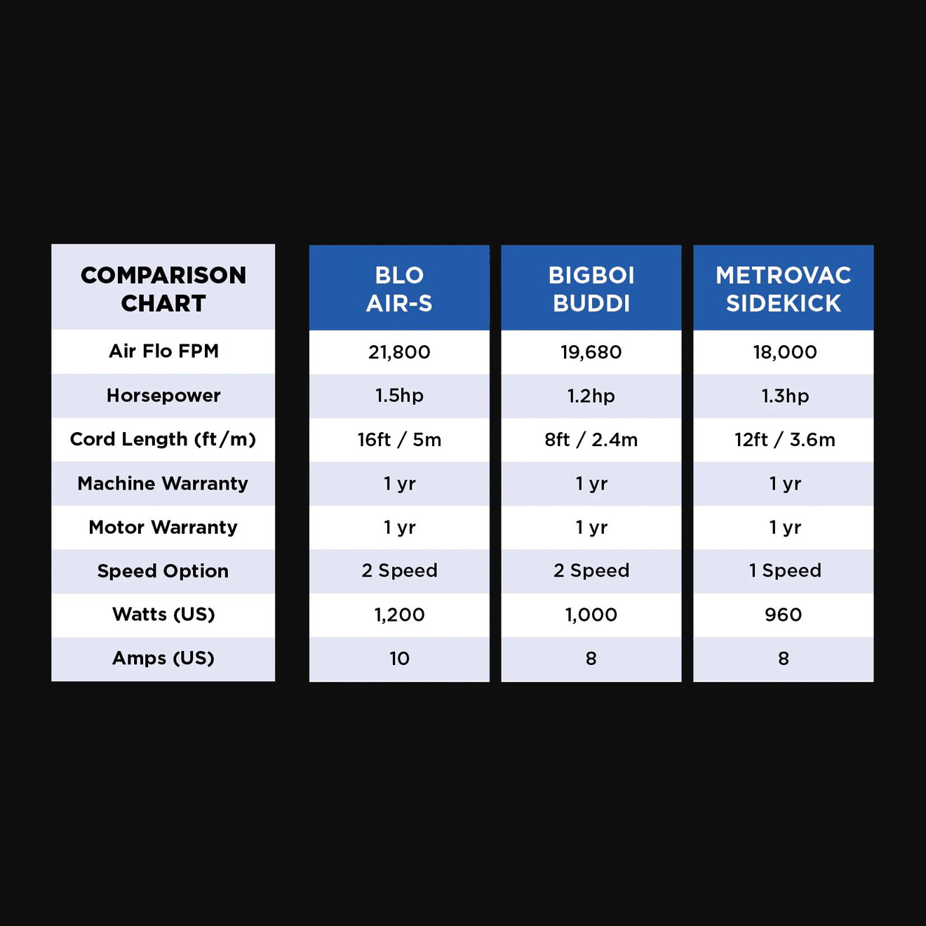 Po sukcesie swoich większych braci (RS i GT), zespół BLO AIR postanowił stworzyć coś "praktycznego i poręcznego" dla entuzjastów, którzy nie potrzebują lub nie mają miejsca na większą suszarkę. Przyjrzano się małym suszarkom do motocykli i samochodów, co zaowocowało powstaniem modelu BLO AIR-S. Szybko zauważono, że powietrze musi wypływać w prostoliniowym strumieniu, aby osiągnąć maksymalną wydajność i skuteczność. Prędkość wylotowa powinna być również wyższa niż w istniejących na rynku urządzeniach. Wybrano zatem najsilniejszy silnik, który jednocześnie był bardzo lekki, co jeszcze bardziej poprawiło jego poręczność.