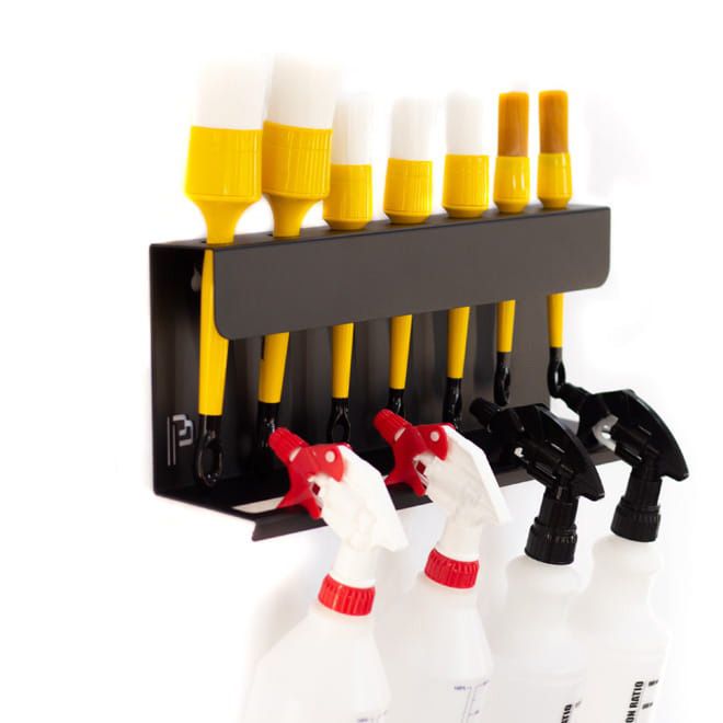Mit einer Länge von 40cm fasst der Pinsel- und Flaschenhalter von Poka sieben Pinsel und je nach Größe mehrere Drucksprüher und Sprühflaschen im unteren Einhängkanal. Die Pinselöffnungen und der Einhängkanal ist mit allen üblichen Pinseln und Flaschen kompatibel. Die Konstruktion ist robust und trägt bis zu 10kg. Zum Einsatz kommt auch hier galvanisierter Stahl und die Poka Premium Pulverbeschichtung.